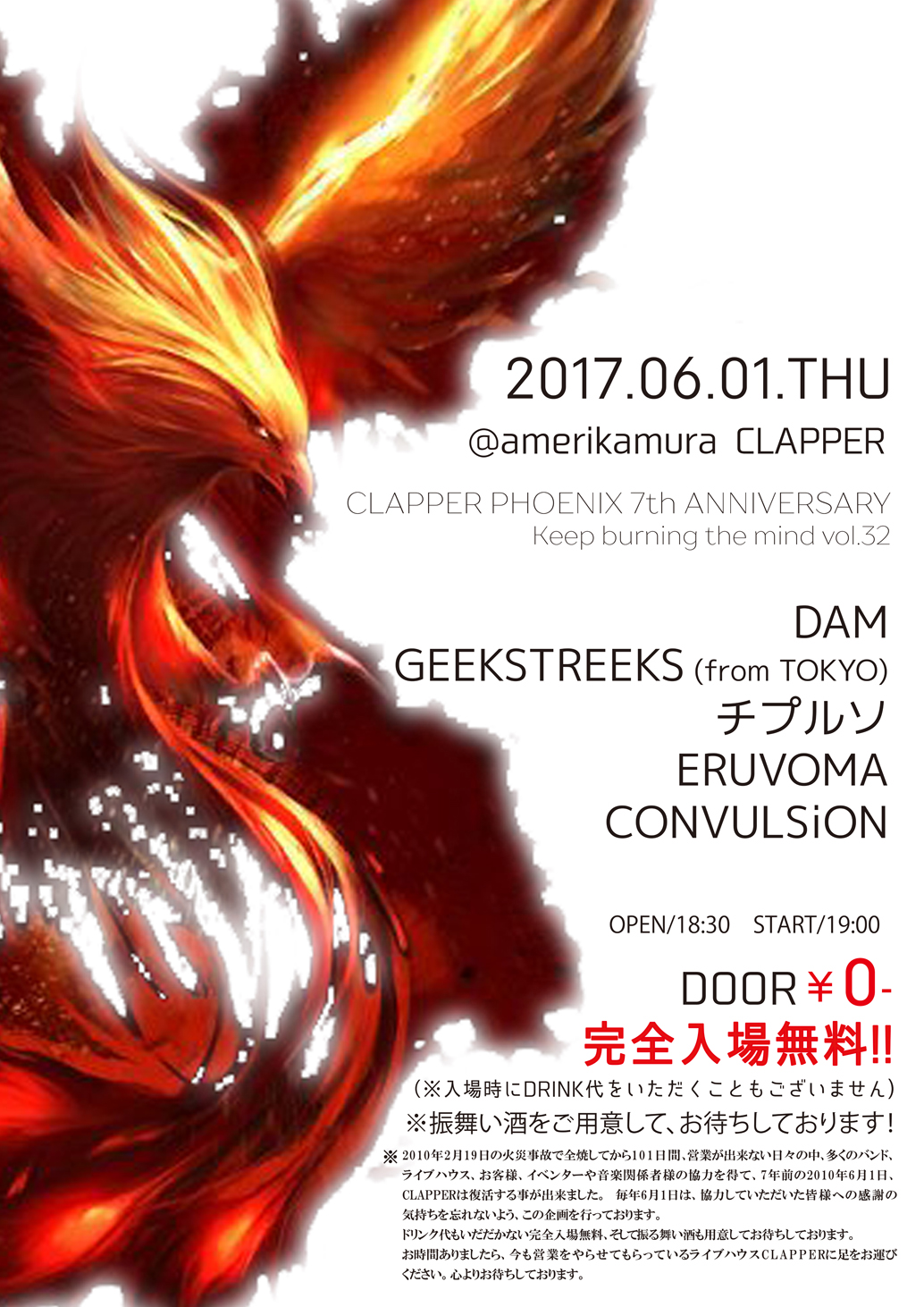 ※2010年2月19日の火災事故でCLAPPERが全焼してから101日間、営業が出来ない日々の中、多くのバンド、ライブハウス、お客様、イベンター様や音楽関係者様の協力を得て、7年前の2010年6月1日、CLAPPERは復活する事が出来ました。