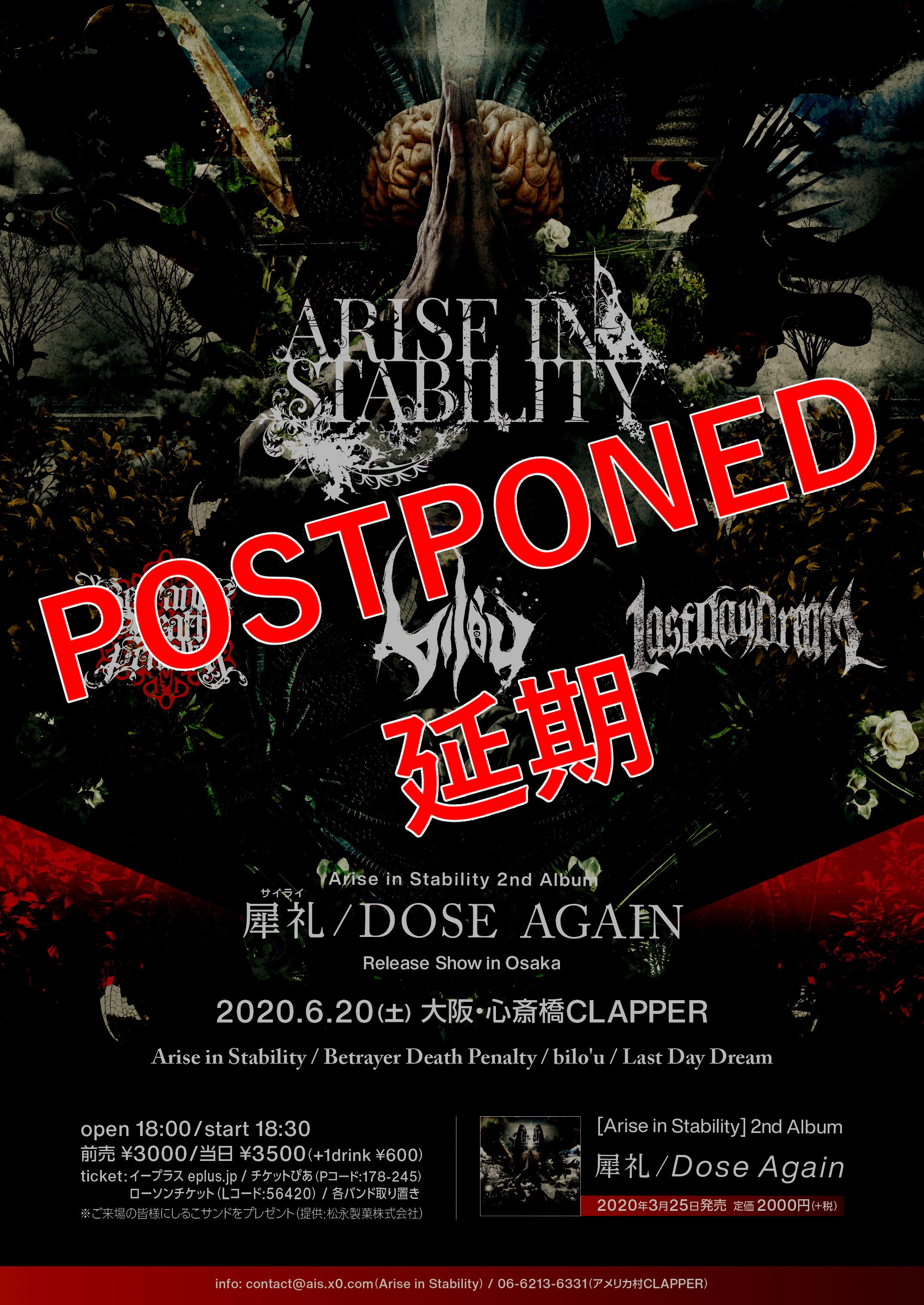 緊急事態宣言の解除は広まりつつありますが、ライブハウスへの休業要請や都道府県を跨いだ移動に関する自主要請は続く見込みです。その最中、関東圏のバンドが大阪で企画するという要素も踏まえ、延期の判断に至りました。