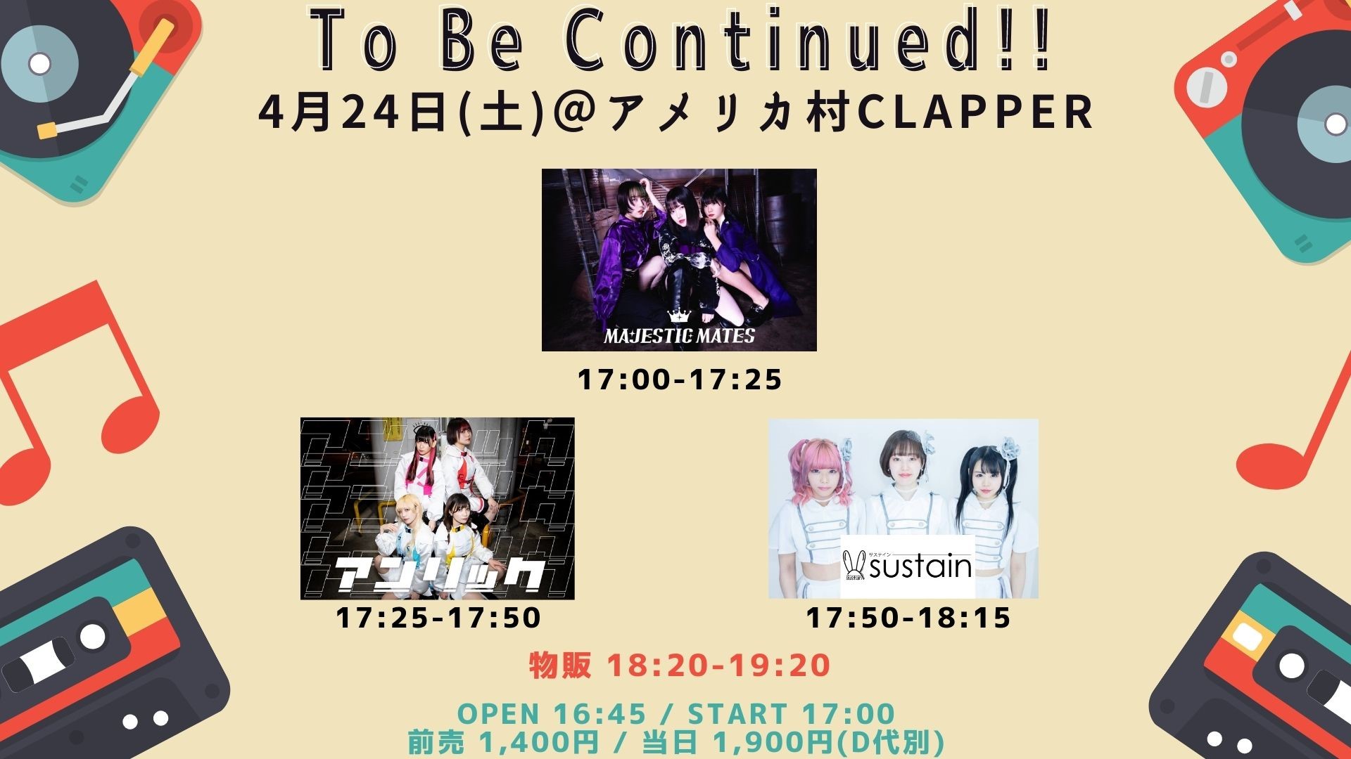 ※Sleepless With Isabelle、ZEST は出演キャンセルとなりました。それに伴いOPEN/STARTが[OPEN16:15 / START16:45]に変更となります。 ご迷惑をおかけしますが、ご理解のほどよろしくお願いいたします。
